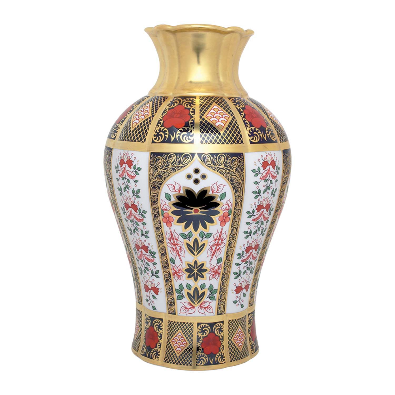 This exquisite vase features heavily embellished 22-carat gold decoration, showcasing a modern twist on the classic Old Imari pattern.